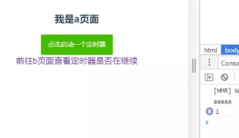 我在a页面写一个定时,让他每秒钟打印一个1,然后跳转到b页面,此时可以看到,定时器依然在执行。这样是非常消耗性能的。如下图所示: